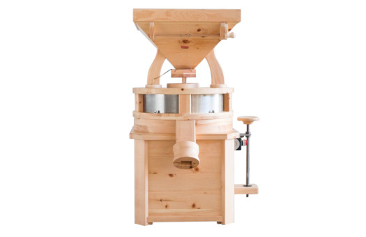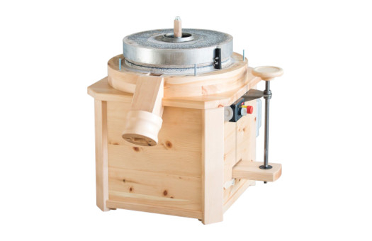 | Pression des meules | La pression des meules exercée sur le grain se règle avec une molette située à droite du moulin qui soulève ou laisse reposer la meule supérieure tournante. Une pression légère premet de ne pas échauffer les farines. |
