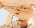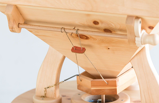 Les réglages de ce moulin sont simples et empiriques; il suffit de pencher + ou - un auget vibrant qui distribue le grain dans les meules.